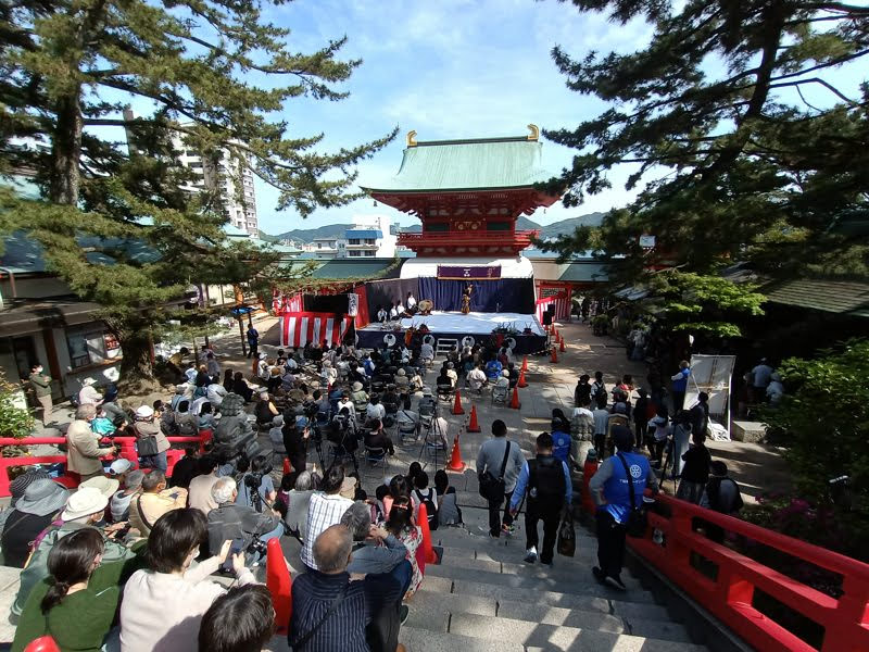 今年もこの特設舞台で実施された。全部を見学する気はなかったので、訪れた時見たものは源平の弓合戦。最後に全員で挨拶。今年の連休は各地で旅行客があふれて渋滞情報が出ていたほど。その人の波が当地にも来た。県外ナンバーの車が多く唐戸周辺の道路はいっぱいで駐車場探しの車が多かった。唐戸市場の内部もこの様子。これだけの人の数は近頃見たことはなかった。握り寿司等の買い物後の食事をするウッドデッキ周りもこんな様子。人、人人。それでもこの五月晴れの下でおいしいものを食べて楽しそうな人々がいっぱい。人の波は普段人が入らない赤い灯台の近くのベンチまで混んでいた。そして下関と門司港を結ぶ関門海峡連絡船も人が多く、乗船待ちの列の最後尾案内が出たほど。巌流島行きも含めて臨時便で対応したみたい。私はここのファミマで買ったコーヒーをベンチで飲みながら見ていただけ。今日の赤間神宮は内部で行事があったかも知れないが表周りには参拝客のみであった。逆にこの青空に神宮の背景の山の木々の新緑がまぶしかったほど。赤間神宮から唐戸へ