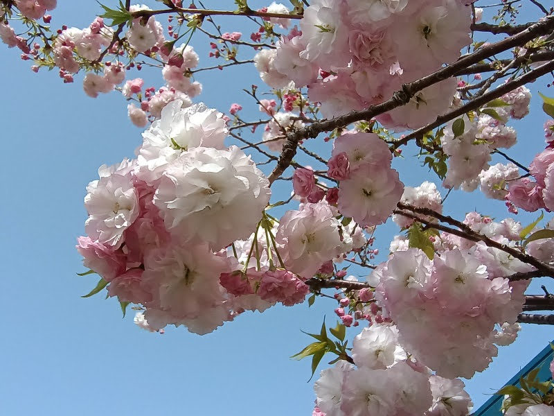 唐戸の遊園地、はいからっと横町の塀沿いに桜が植えられている。ソメイヨシノが散った後,遅咲きのこの桜が咲き始めて、それが今満開。 八重桜特有のピンクと白が重なったような花びら。 八重の花が丸まったボタンの花のようだからボタン桜とも呼ばれることもあるらしい。花にはサトザクラの名前もあるがこれは園芸種の総称らしい。どっちにしてもこれでこの春の桜は見納め。 唐戸から見た関門橋。今日も黄砂で霞んでいる。黄砂来襲